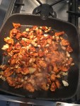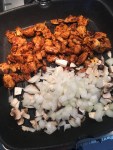 Skerð kjúklingabringurnar niður í litla bita, setur örlítinn sítrónusafa yfir kjúklinginn og svo kryddar með hvítlaukskryddblöndu. Steikir síðan kjúklinginn á pönnu, ég blandaði lauk og sveppum bara með kjúklingum. Þannig allt var blandað saman, en auðvitað hægt að steikja kjúklinginn sér og grænmetið sér.